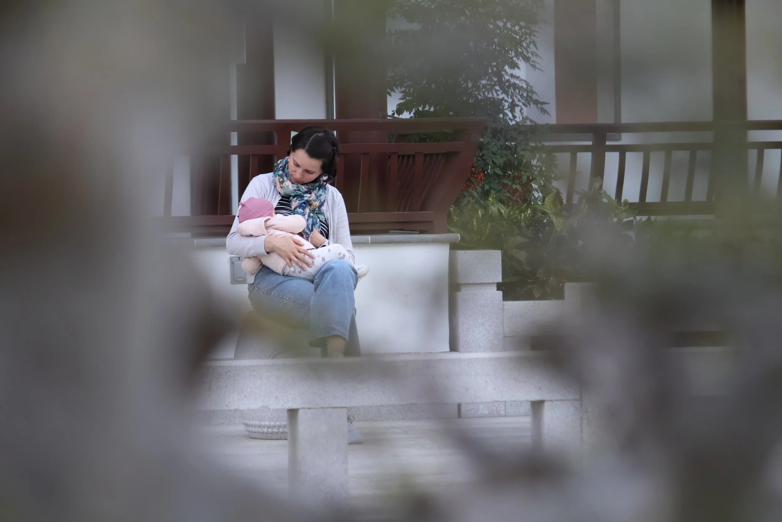 We rest on a white marble stool,